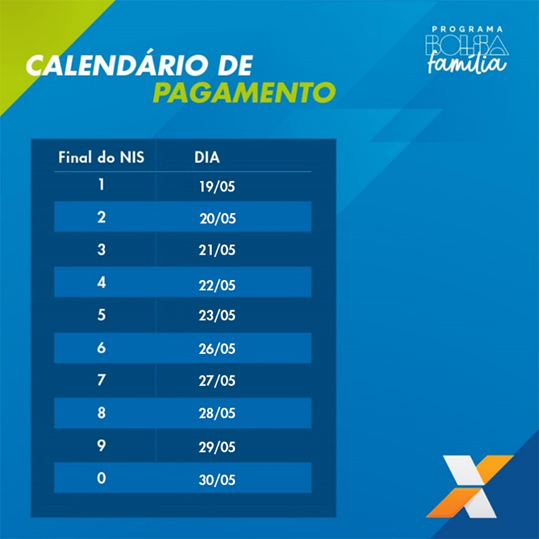A CAIXA inicia, na próxima segunda-feira (19), o pagamento do Programa Bolsa Família referente ao mês de maio. As famílias que recebem seu benefício pelo CAIXA Tem podem movimentar os recursos pelo App. O pagamento do benefício é realizado de acordo com o final do Número de Identificação Social – NIS, com término previsto para dia 30/05. Ao todo cerca de 20,4 milhões de famílias recebem o Bolsa Família.